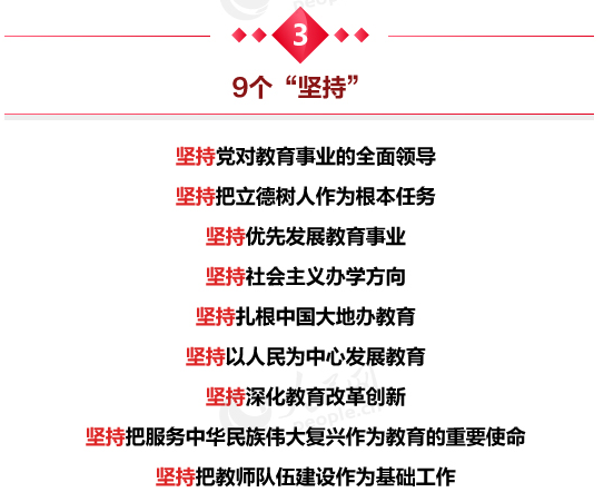 习近平指出,在实践中,我们就教育改革发展提出一系列新理念新思想新观点,主要有以下几个方面,坚持党对教育事业的全面领导,坚持把立德树人作为根本任务,坚持优先发展教育事业,坚持社会主义办学方向,坚持扎根中国大地办教育,坚持以人民为中心发展教育,坚持深化教育改革创新,坚持把服务中华民族伟大复兴作为教育的重要使命,坚持把教师队伍建设作为基础工作。这是我们对我国教育事业规律性认识的深化,来之不易,要始终坚持并不断丰富发展。
