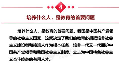 习近平指出,培养什么人,是教育的首要问题。我国是中国共产党领导的社会主义国家,这就决定了我们的教育必须把培养社会主义建设者和接班人作为根本任务,培养一代又一代拥护中国共产党领导和我国社会主义制度、立志为中国特色社会主义奋斗终身的有用人才。这是教育工作的根本任务,也是教育现代化的方向目标。