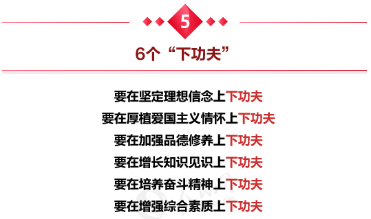 习近平强调,要在坚定理想信念上下功夫,教育引导学生树立共产主义远大理想和中国特色社会主义共同理想,增强学生的中国特色社会主义道路自信、理论自信、制度自信、文化自信,立志肩负起民族复兴的时代重任。要在厚植爱国主义情怀上下功夫,让爱国主义精神在学生心中牢牢扎根,教育引导学生热爱和拥护中国共产党,立志听党话、跟党走,立志扎根人民、奉献国家。要在加强品德修养上下功夫,教育引导学生培育和践行社会主义核心价值观,踏踏实实修好品德,成为有大爱大德大情怀的人。要在增长知识见识上下功夫,教育引导学生珍惜学习时光,心无旁骛求知问学,增长见识,丰富学识,沿着求真理、悟道理、明事理的方向前进。要在培养奋斗精神上下功夫,教育引导学生树立高远志向,历练敢于担当、不懈奋斗的精神,具有勇于奋斗的精神状态、乐观向上的人生态度,做到刚健有为、自强不息。要在增强综合素质上下功夫,教育引导学生培养综合能力,培养创新思维。要树立健康第一的教育理念,开齐开足体育课,帮助学生在体育锻炼中享受乐趣、增强体质、健全人格、锤炼意志。要全面加强和改进学校美育,坚持以美育人、以文化人,提高学生审美和人文素养。要在学生中弘扬劳动精神,教育引导学生崇尚劳动、尊重劳动,懂得劳动最光荣、劳动最崇高、劳动最伟大、劳动最美丽的道理,长大后能够辛勤劳动、诚实劳动、创造性劳动。