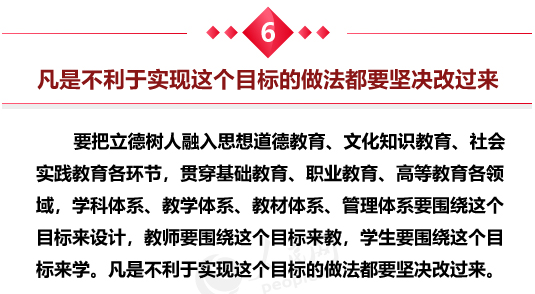 习近平指出,要努力构建德智体美劳全面培养的教育体系,形成更高水平的人才培养体系。要把立德树人融入思想道德教育、文化知识教育、社会实践教育各环节,贯穿基础教育、职业教育、高等教育各领域,学科体系、教学体系、教材体系、管理体系要围绕这个目标来设计,教师要围绕这个目标来教,学生要围绕这个目标来学。凡是不利于实现这个目标的做法都要坚决改过来。