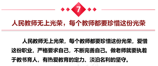 习近平强调,建设社会主义现代化强国,对教师队伍建设提出新的更高要求,也对全党全社会尊师重教提出新的更高要求。人民教师无上光荣,每个教师都要珍惜这份光荣,爱惜这份职业,严格要求自己,不断完善自己。做老师就要执着于教书育人,有热爱教育的定力、淡泊名利的坚守。随着办学条件不断改善,教育投入要更多向教师倾斜,不断提高教师待遇,让广大教师安心从教、热心从教。对教师队伍中存在的问题,要坚决依法依纪予以严惩。