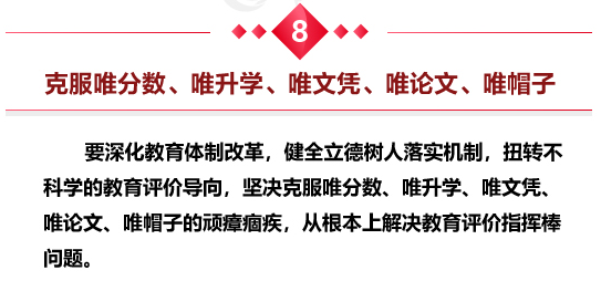 习近平指出,要深化教育体制改革,健全立德树人落实机制,扭转不科学的教育评价导向,坚决克服唯分数、唯升学、唯文凭、唯论文、唯帽子的顽瘴痼疾,从根本上解决教育评价指挥棒问题。要深化办学体制和教育管理改革,充分激发教育事业发展生机活力。要提升教育服务经济社会发展能力,调整优化高校区域布局、学科结构、专业设置,建立健全学科专业动态调整机制,加快一流大学和一流学科建设,推进产学研协同创新,积极投身实施创新驱动发展战略,着重培养创新型、复合型、应用型人才。要扩大教育开放,同世界一流资源开展高水平合作办学。