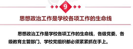 习近平强调,加强党对教育工作的全面领导,是办好教育的根本保证。教育部门和各级各类学校的党组织要增强“四个意识”、坚定“四个自信”,坚定不移维护党中央权威和集中统一领导,自觉在政治立场、政治方向、政治原则、政治道路上同党中央保持高度一致。各级党委要把教育改革发展纳入议事日程,党政主要负责同志要熟悉教育、关心教育、研究教育。各级各类学校党组织要把抓好学校威廉希尔作为办学治校的基本功,把党的教育方针全面贯彻到学校工作各方面。思想政治工作是学校各项工作的生命线,各级党委、各级教育主管部门、学校党组织都必须紧紧抓在手上。要精心培养和组织一支会做思想政治工作的政工队伍,把思想政治工作做在日常、做到个人。