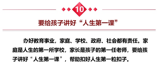 习近平指出,办好教育事业,家庭、学校、政府、社会都有责任。家庭是人生的第一所学校,家长是孩子的第一任老师,要给孩子讲好“人生第一课”,帮助扣好人生第一粒扣子。教育、妇联等部门要统筹协调社会资源支持服务家庭教育。全社会要担负起青少年成长成才的责任。各级党委和政府要为学校办学安全托底,解决学校后顾之忧,维护老师和学校应有的尊严,保护学生生命安全。