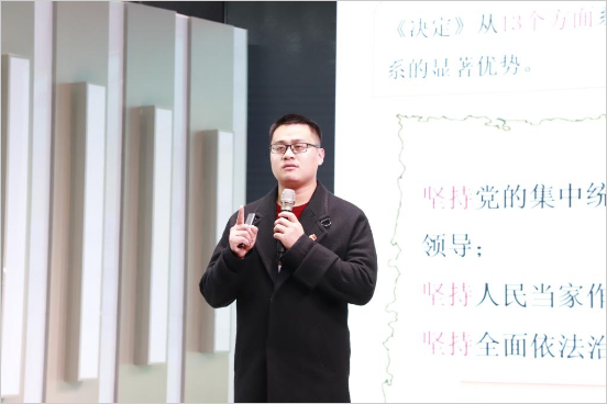 刘明辉宣讲的主题是《坚持制度自信开辟“中国之治”新境界》。他以高度凝练的语言全面准确地介绍了中国特色社会主义制度和国家治理体系的显著优势,坚持和完善中国特色社会主义制度、推进国家治理体系和治理能力现代化的重大意义、总体要求、总体目标和重点任务。接着,他又以“中国奇迹”、“中国硬核”、“中国温情”、“中国速度”、“中国精神”为起转承合,以丰富的事例,详实的数据,生动的语言,将“中国之治”的伟大成果娓娓道来。结尾处,他还以激人奋进的情感向青年朋友们发出了“你是中国人吗,你爱中国吗,你希望中国好吗”的历史三问、时代三问、未来三问,赢得了在场青年朋友的阵阵掌声。