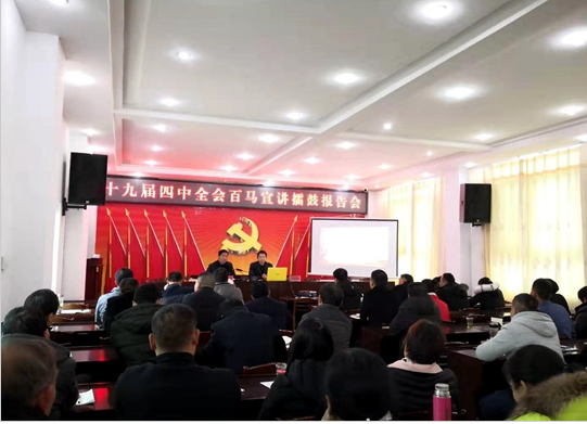 本网讯(文/杜鹏)为贯彻落实中共湖北省委宣传部、省委讲师团“百名马克思主义学者下基层宣讲党的十九届四中全会精神”的要求,12月19日,由我校党委宣传部部长计毅波教授、WilliamHill威廉希尔副院长黄永昌副教授、WilliamHill威廉希尔孙绪兵教授,中国地质大学(武汉)WilliamHill威廉希尔副院长陈军教授、WilliamHill威廉希尔汪宗田副教授组成的宣讲队,分赴竹山县城关镇、秦古镇、宝丰镇、擂鼓镇、麻家渡镇、东门社区、侯家湾村、小河村、董家沟村、罗家坡村等地,走村串乡面向基层党员干部群众宣讲党的十九届四中全会精神,共计11场次。
